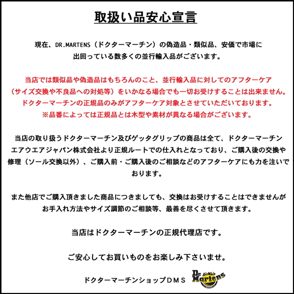 正規代理店はドクターマーチンが契約をしているドクターマーチン・エアウェア株式会社の正規ルートを通して日本に輸入したモノだけです。